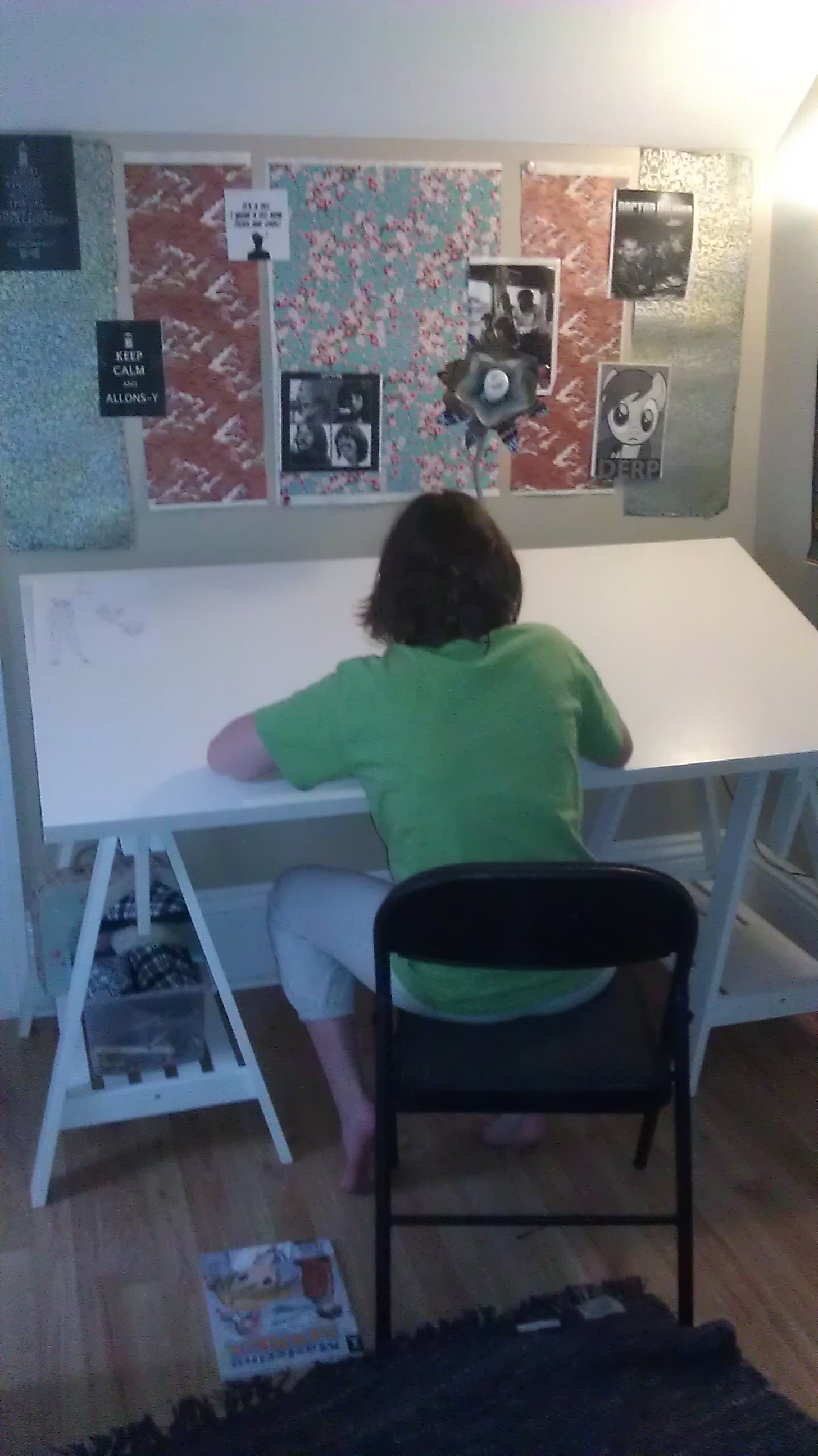 So while Violet was gone we set her up a little drawing space. Apart from the practical considerations of stopping her contorting her body in weird ways to draw in really uncomfortable places, I hope it tells her that someone takes her art seriously, and that she can take it seriously too. I hope it’s one more concrete way we let her know that in this house we value creativity, art, and the love of making stuff at least as much as we value AP and SAT II exams.